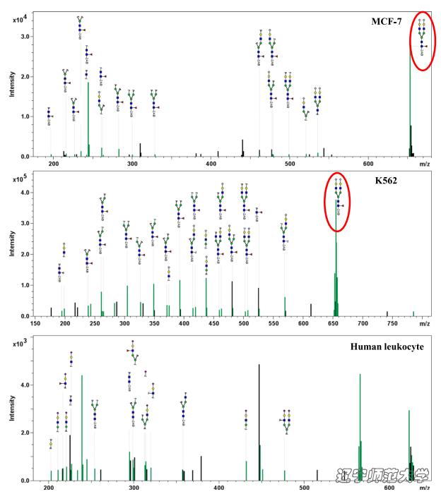 为了证明这一点,同时利用Biacore T200特有的分子垂钓功能,成功找到了LIP的受体。将LIP作为「诱饵」直接固定在CM5芯片上,以糖苷酶处理后的肿瘤细胞裂解液作为分析物,利用Biacore T200直接回收得到所有可能与LIP结合的分子,随后再通过质谱鉴定。质谱鉴定结果显示与糖芯片N003G十分相似的糖型特征,仅多一个岩藻糖修饰,而在对照的正常细胞的裂解液中并未发现类似的糖型结构。