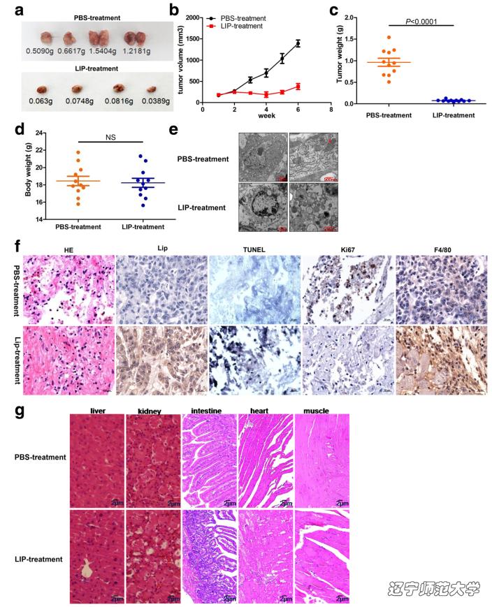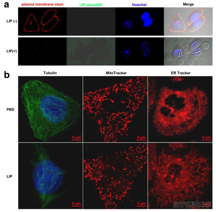 LIP主要作用于肿瘤细胞质膜上,能够破坏微管和线粒体的网状形态,使其片段化,而管状网络的内质网被转化为空泡特征。此外,LIP作用肿瘤细胞后,肿瘤细胞质中的甘油醛-3-磷酸脱氢酶(GAPDH),α-微管蛋白(α-tubulin),细胞色素C(Cytc)和蛋白质二硫键异构酶(PDI)释放到细胞外培养基中,说明LIP导致破坏肿瘤细胞膜结构。