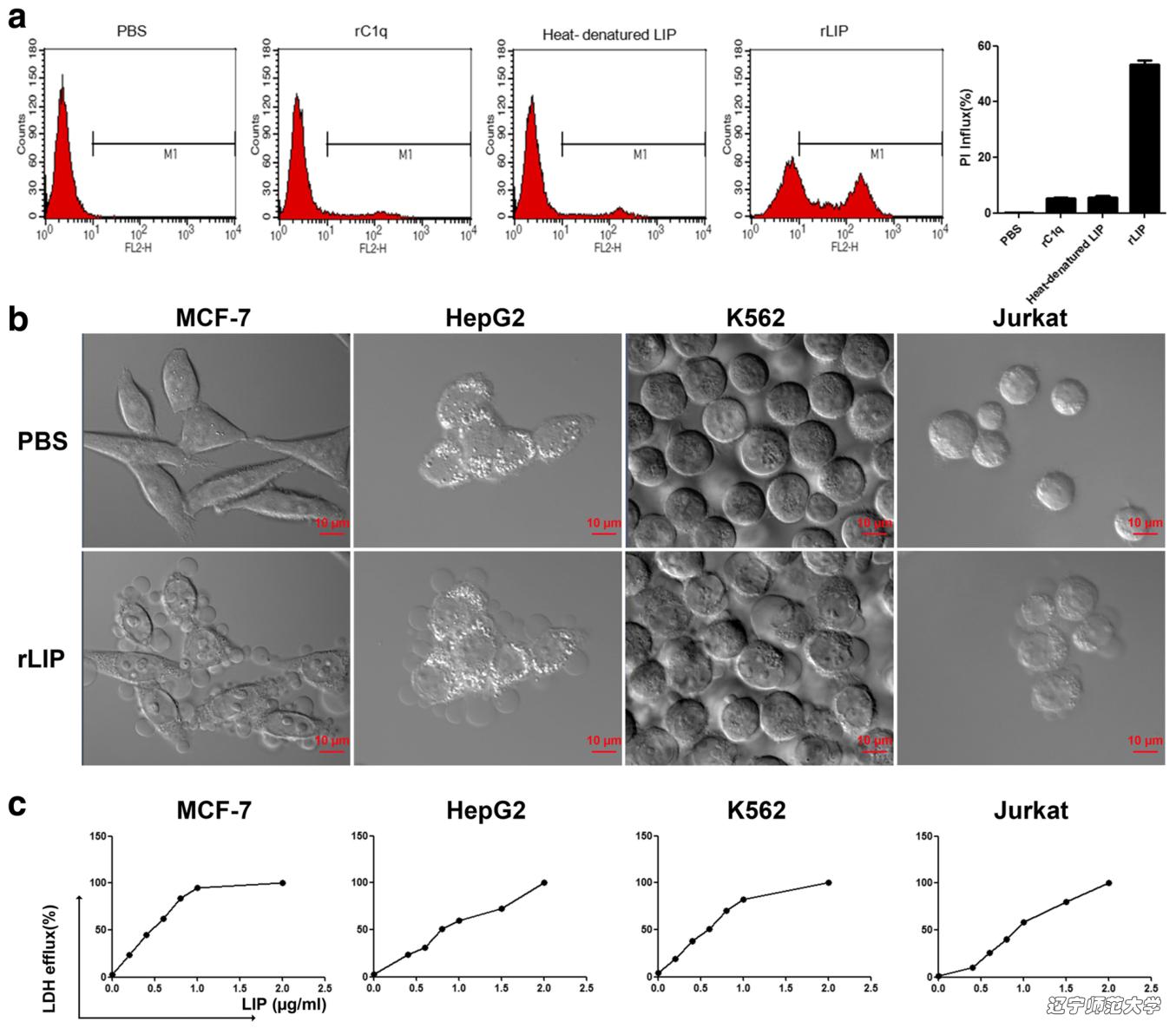 LIP诱导肿瘤细胞的死亡典型的特征是在细胞表面形成球形囊泡状突起最后细胞解体。使用LDH分析检测LIP对杀伤肿瘤细胞的半致死量。LIP给药后12小时MCF-7、HepG2、K562和Jurket细胞的LD50值分别为:0.52 μg/mL,0.75 μg/mL,0.63 μg/mL,0.98 μg/mL。