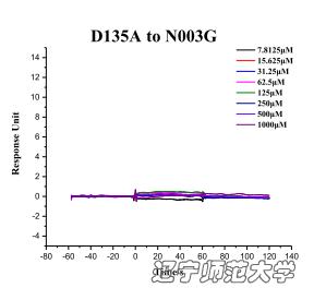 结合LIP的三维结构数据预测第135位的天冬氨酸可能比较关键Biacore T200的检测结果再次验证了这一假设。D135A突变的LIP蛋白完全不能结合N003G,充分证明D135A作为关键的氨基酸,介导了LIP与N003G的结合,并且这一结果与晶体结构数据完全一致。