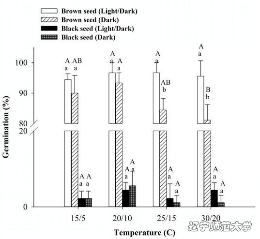Figure 2. Effect of temperature and light on germination of dimorphic seeds of Suaeda glauca