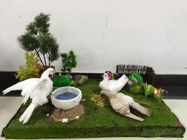 本作品在制作过程经过了处死、剥皮、洗涤、吹干、防腐、填充、支架、缝合和定形等步骤。作品中的三只鸽子在园内或饮水、或进食,饮食之间尽显田园生活的悠然。在篱笆围成的小园里,有忘季盛开的花和慕名而来的蝶,一只白鸽徐徐落在井边,另外两只白鸽与灰鸽享受着主人家为其投放的食物。此刻,时间定格,形成了一副曼妙的田园风光画卷。